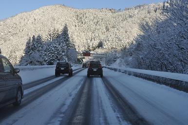 郡上八幡ICを過ぎた辺りから道路上に雪が出てきました